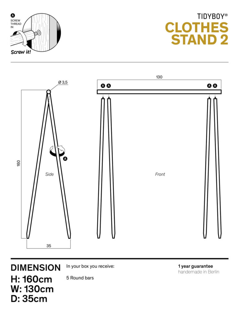 Mit seiner großzügigen Höhe und Breite bietet der KL.2 Kleiderständer genug Platz, um sowohl lange Mäntel als auch kürzere Jacken aufzuhängen. Die Tiefe von 35 cm sorgt dafür, dass der Kleiderständer stabil steht und gleichzeitig nicht zu viel Raum einnimmt.