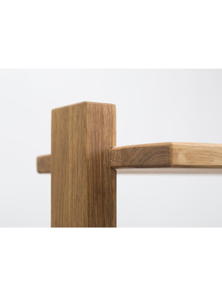 Strong in stature and function, now also with wooden hemispheres. The valet stand is passed down from generation to generation. Old version only had a hanger on the back of the stand. In this design, I placed the bar on the sides, so the user can hang up to 8 jackets or shirts on hangers on the round rail. The butler is designed so that the gentleman can hang the entire outfit and accessories. A thoroughly well-thought-out piece of furniture.